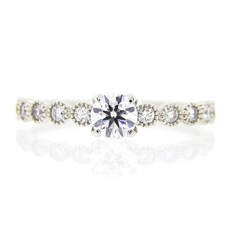 - 一つ一つのダイヤモンドが持つ美しさを統合する。ダイヤモンドと着ける人の 魅力を融合し、引き上る、Dラインのクラシックスタイル、ミルグレインのセン ターダイヤモンドバージョン。