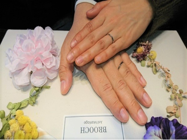おふたりの指輪選びのこだわりは「ペアリングがいい!」ということでした。おふたりのテーマは「シンプル・プラチナ」で毎日着けても丈夫で着け心地が良いものというのも重要視されていました。