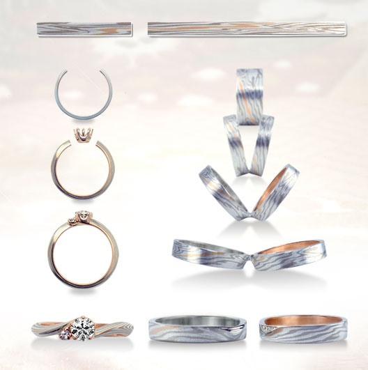 杢目金屋は、江戸時代から続く伝統技法をリングに取り入れ作られた唯一無二のブランドです。金属を何枚も重ね合わせることによって木目模様が見えます。素材の組み合わせは自由自在で同じ形でも金属の組み合わせによって色合いや模様の出方が変わってくるので印象も違って見え、おふたりだけの模様のリングが出来上がります。