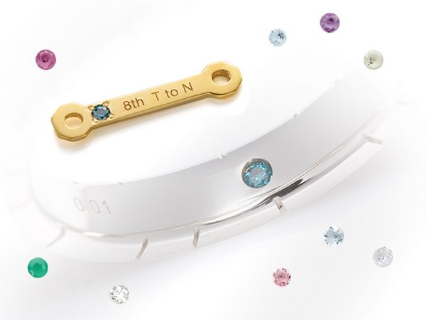 婚約ネックレスには、裏面に刻印や誕生石(アニバーサリーストーン)を入れることができます。誕生石やブルーダイヤモンドをお守りのように忍ばせれば、ふたりだけの特別な記念ジュエリーに。