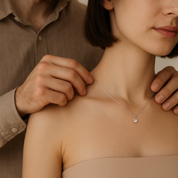 婚約の証といえば「婚約指輪」というイメージが強いですが、最近では“婚約ネックレス”を選ぶカップルも増えています。仕事柄リングを身に着けにくい方や、特別なジュエリーを普段使いしたい方にとって、ネックレスは実用的で人気の高いアイテム。胸元にきらめくダイヤモンドは、見るたびにプロポーズの感動を思い出させてくれます。