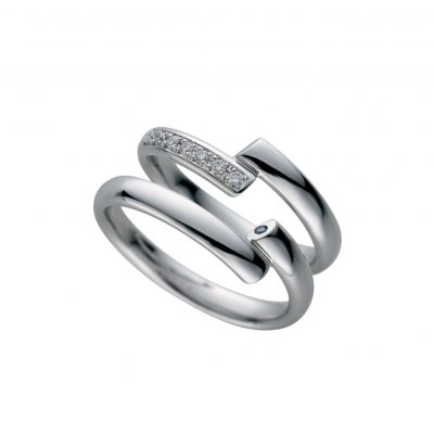梢で休む様にされげなく光るメレダイヤは、「温かさ満ち溢れる心地よい場所」であることへのメッセージ。ナチュラルな腕の流れは大人しく真っ直ぐなラインのマリッジとも相性が良い!重ね着けは、花嫁様をより上品に高貴に♪華やかさの中にあるクラシックな上品さ。とてもきれいなデザインです。