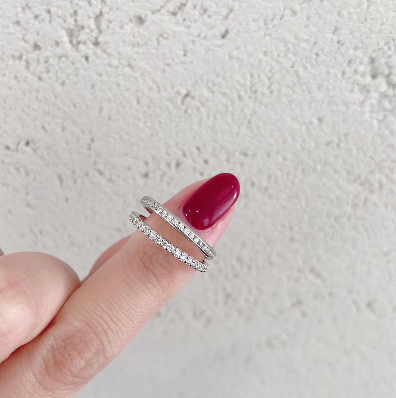 エタニティリングは通常のエンゲージリングのように、ダイヤモンドが上にポンと飛び出しているものではなく、リングの幅と同じサイズのダイヤモンドがリングの全周に付いている、普段使いしやすいデザイン。でもダイヤモンドは全周に付いているので、華やかといえば華やかで、お出かけにもばっちり使えます。