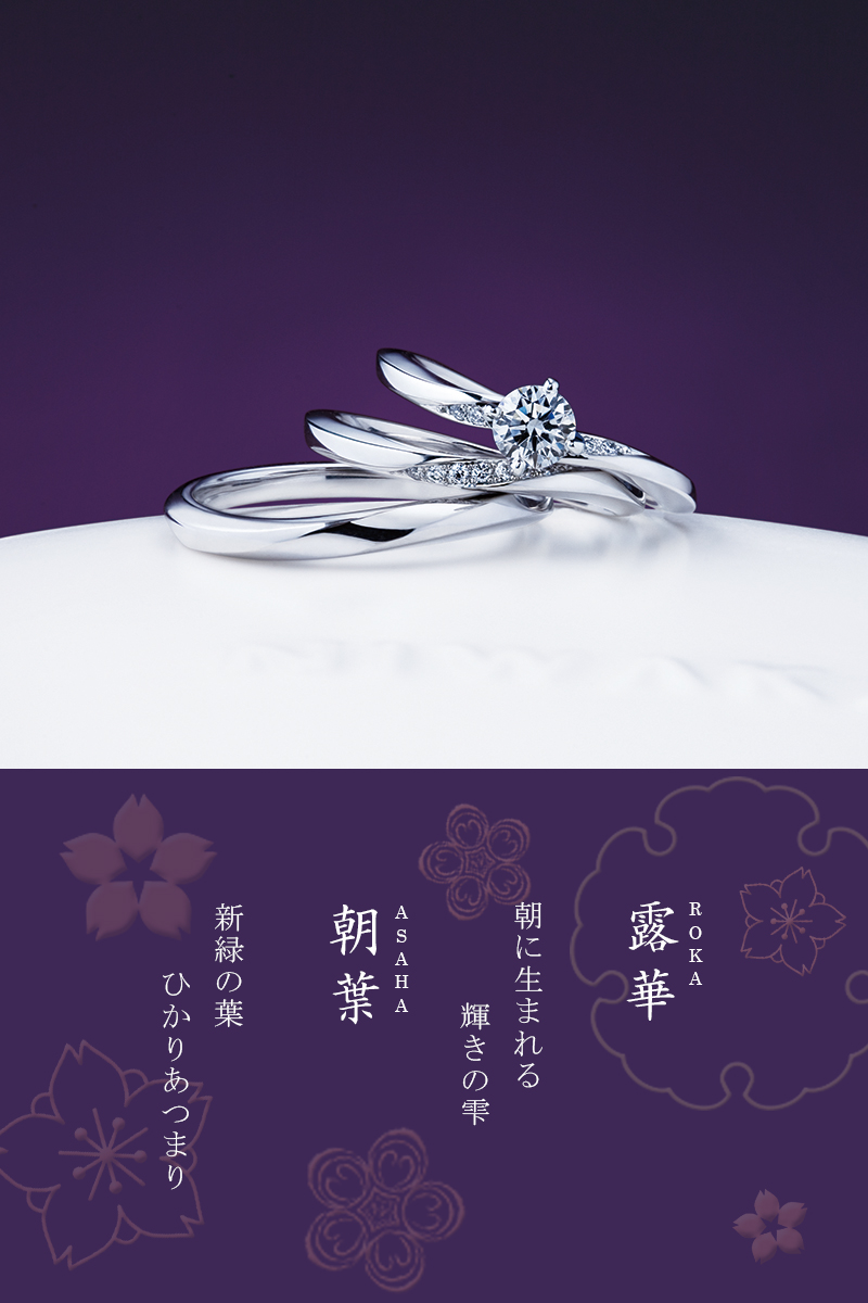 俄のブライダルジュエリーには、指輪ひとつひとつに名前と和の美しい情景が込められているので、色々と想像しながらおふたりの間であった出来事や出会いともマッチするストーリーが見えてきます!!