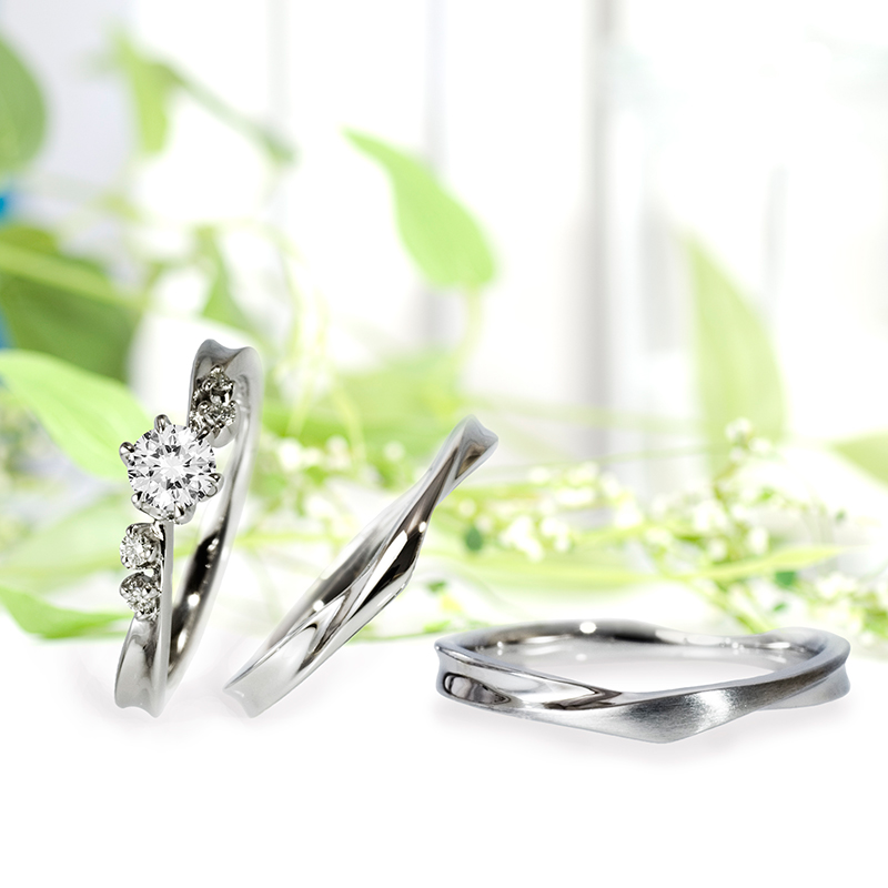 おふたりだけを取り巻くように吹いた一陣の風をイメージしたリングです。風のように流れるカーブが指に馴染み幾重にも重なる木目模様が側面からも楽しめるデザインとなっております。エンゲージリングのダイヤにさりげなくついたひとひらの桜の花弁がアクセントになってかわいいですね。木目のデザインが個性的で誰とも被らない唯一無二の特別なリングです。