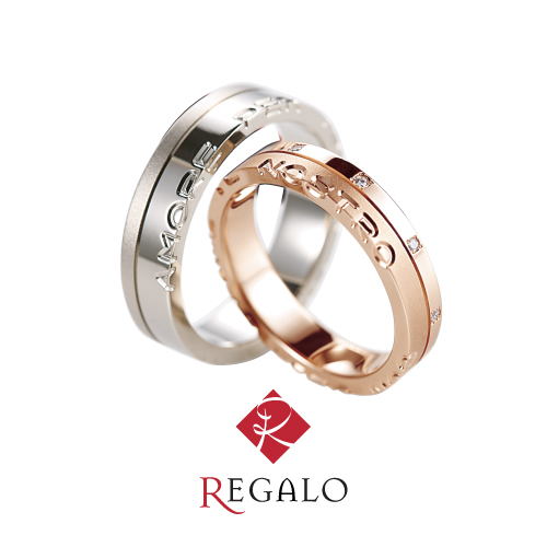 「レガロ」はセミオーダーリングのため、リングの素材、形状、幅、表面仕上げ、ダイヤモンドセッティング、文字彫刻、インサイドセッティングの6つのステップに従って、お二人のイメージに合ったデザインを自由に創作できる、セミオーダータイプのマリッジリングです。