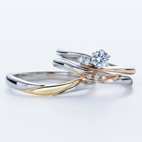 リングの緩やかなカーブは未来へと続く川の流れを、ダイアモンドは水面の輝きを表現した細身のスッキリとしたデザインがとてもきれいな結婚指輪です。清らかな水の音のように穏やかな人生を歩むふたりをイメージしています。