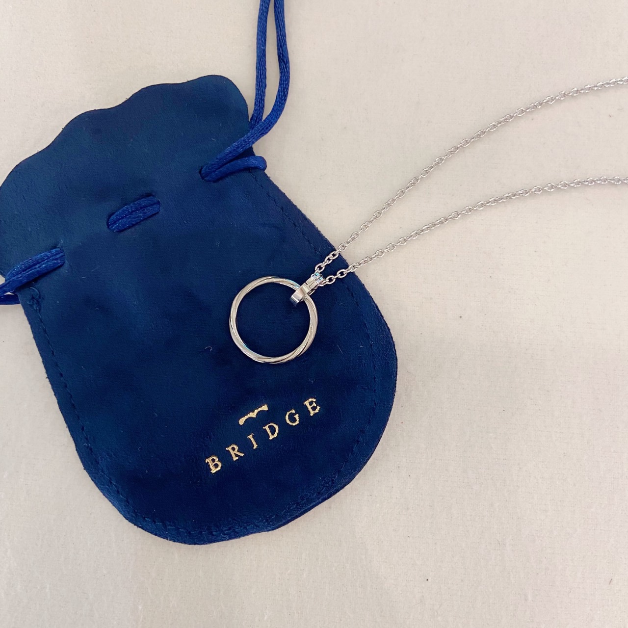 このリングコネクターに通すと、チェーンも美しくリングも安定するのでリングがどこへ行ったと気になることもなく着けていただけます。