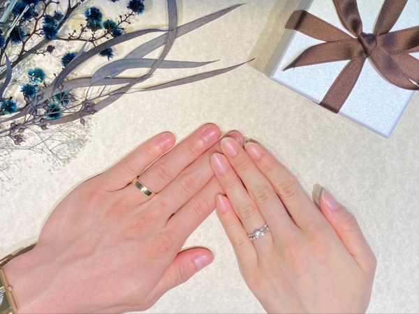 ご主人様は、プラチナの甲丸にされ、シンプルで着けやすいデザインにされ、奥様は、ミル打ちが施されたダイヤなしでもきれいなピンクゴールドノデザインでお作りいただきました!おふたりらしいこだわりの結婚指輪が出来上がり本当に良かったです。また、クリーニングやメンテナンス、おふたりの記念日にお越しください。お待ちしております!