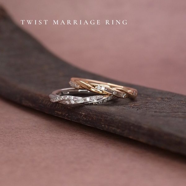 奥さまの結婚指輪は、ねじられた紐のようなデザインの中にダイヤを敷き詰め華やかで上品な印象で、ご主人様の結婚指輪は、センターの深いくぼみにバゲットカットのブラッグダイヤを留めてストレートラインに動きをプラスした個性あふれるデザインです。