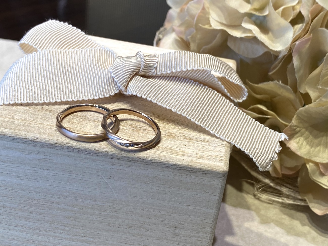 おふたりは、肌なじみのよいピンクゴールドでお作りいただきました!ハンドメイドの繊細で柔らかい仕上がりがピンクゴールドにした時に引き立ち、おふたりにとてもお似合いでした!