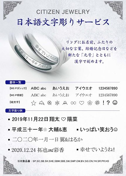 結婚指輪は、おふたりにとって人生の大切な記念品。サムシングブルーのリングは、刻印の自由度が高いことでも人気があります。お互いのイニシャルや記念日、特別なメッセージだけでなく、長めの文章やオリジナルの記号を刻むことも可能です。これにより、おふたりだけの特別な意味を込めたリングを作ることができます。
