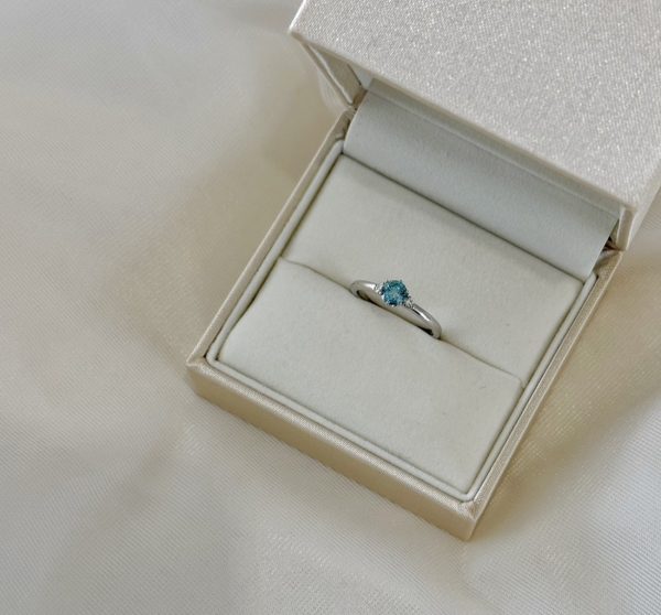 シンプルなデザインがご希望ということで、メインのアイスブルーダイヤモンドが引き立つように、両サイドにホワイトダイヤモンドをセッティングした婚約指輪をご紹介させていただきました。