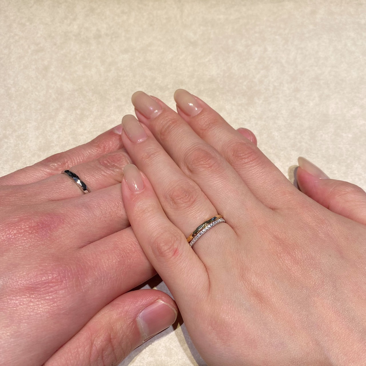 エタニティリングはプラチナ、結婚指輪はゴールドの素材違いで重ねているのもおしゃれでした。