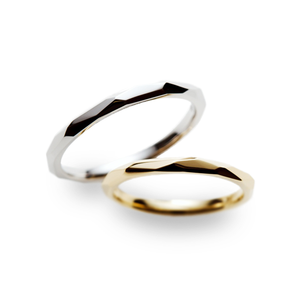 同じデザインでペア感があり、色んな形をしたカットが光を反射し、高級感もあるマリッジリングです。