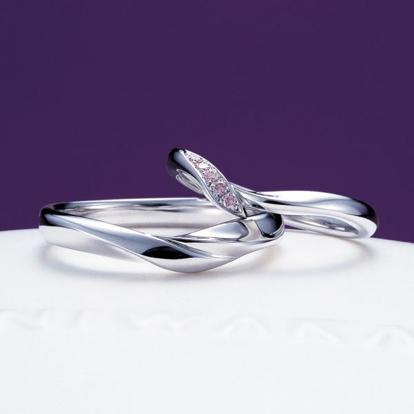 出会った頃の初々しい気持ちを薄紅の桜でイメージ。ウェディングリングの細タイプのデザインは、ひとひらの花びらをメレダイアモンドで表現。太タイプのデザインは、側面にまで及ぶ有機的なラインで、花を支える桜の幹を表現しています。