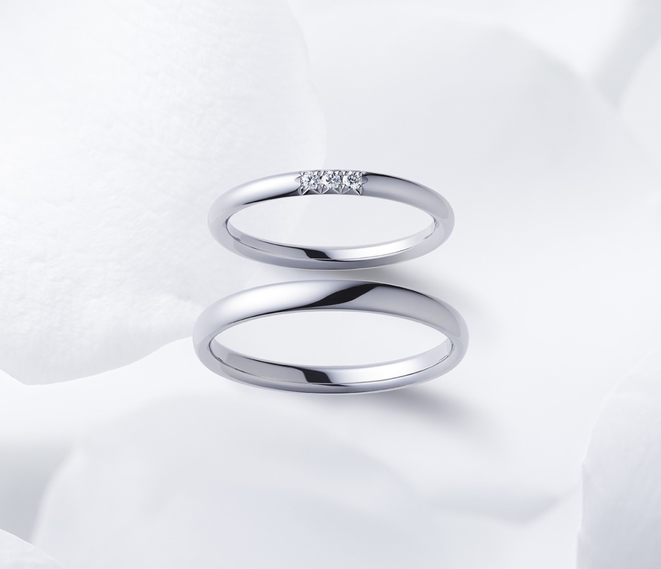 デザインは、飽きのこない王道のストレートリング。レディースリングは、上品に輝く3石のダイヤモンドアレンジが施され、シンプルながらもさりげない輝きがきれいなデザインです。メンズリングは、すっきりとしたシンプルなストレートデザインで、落ち着きと上質さを感じさせてくれます。おふたりの雰囲気にもとてもよくお似合いの、素敵な結婚指輪です。