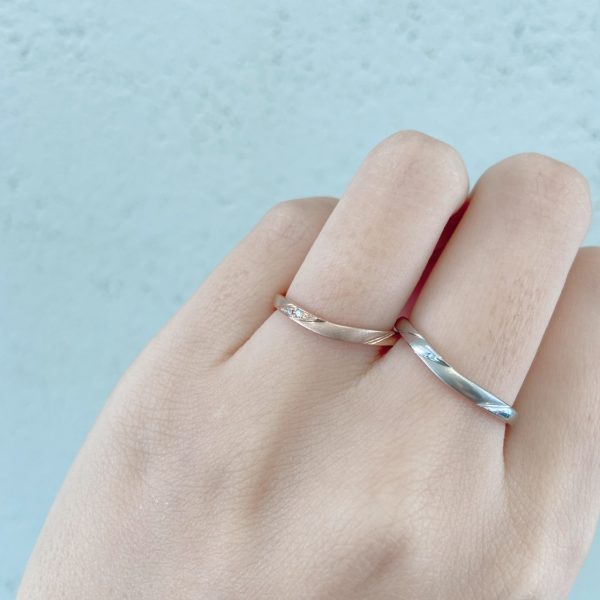 ご主人様は上品でクラシカルな印象のプラチナを、奥様はやわらかな色合いが肌に馴染むピンクゴールドをセレクト。それぞれ異なる素材を選ばれたのも、「人と被らないデザインにしたい」というこだわりと、「違っているからこそふたりらしい」という想いからでした。
