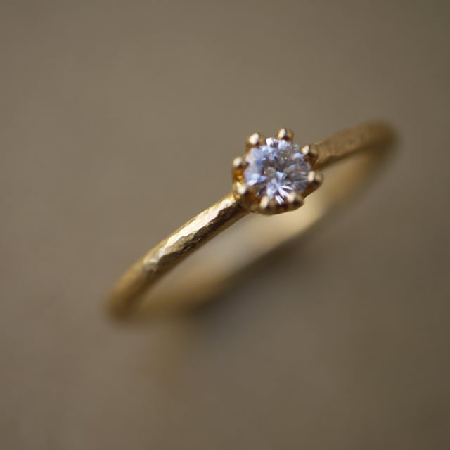 カプリは、王道シンプル1石のデザインですが、YUKAHOJOらしいハンマーで槌目をつけたハンドメイドの質感がとっても素敵で婚約指輪です。