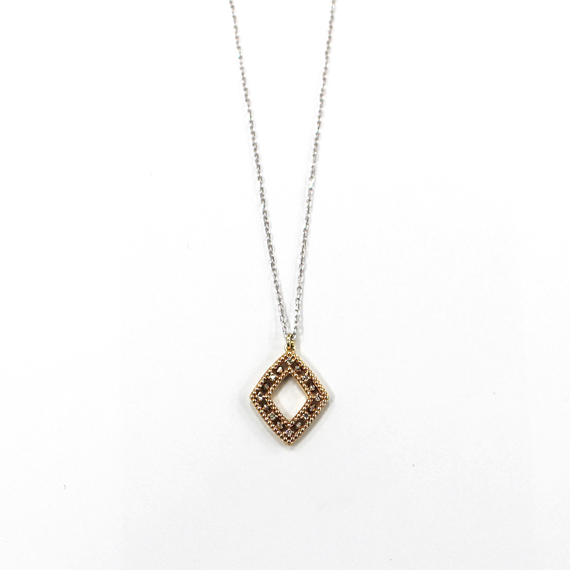 トライアングルモチーフにダイヤモンドを3石セッティング。トップがチェーンに固定されているのでずれる心配もありません。