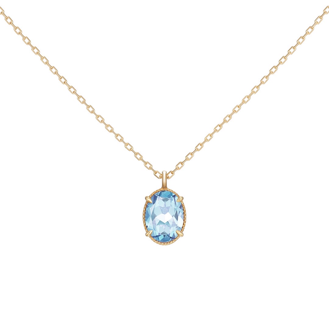 大きく鮮やかなブルーサファイヤが目を引くネックレスです。ブルーサファイヤは9月の誕生石でもあります。