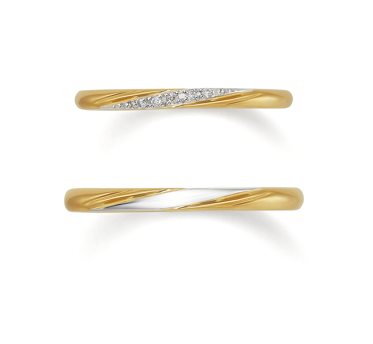 ストレートアームを斜めに走るダイヤモンドがポイント。2色の組み合わせが人気のコンビデザイン。指を細く長く魅せてくれる結婚指輪
