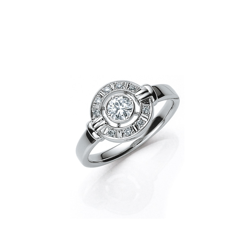まわりを囲むメレダイヤモンドが、センターストーンの存在を際だたせ美しいフォルムとなっています。