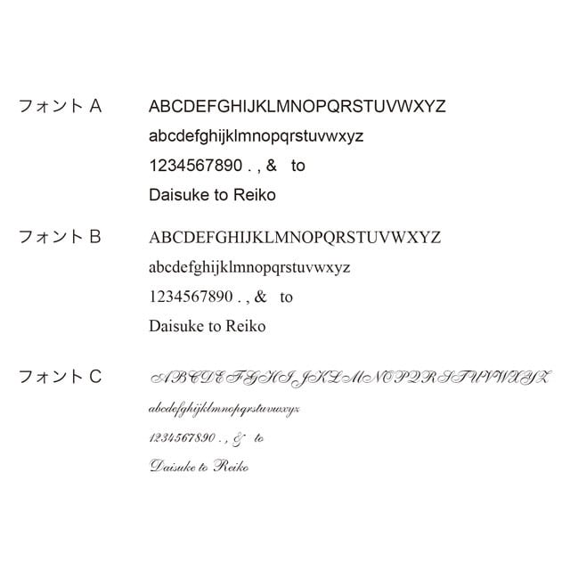 書体の種類(画像のフォントA,B,C)とご希望の刻印内容(4文字まで)をご指定下さい。(数字、アルファベット(大文字・小文字)、&、to)