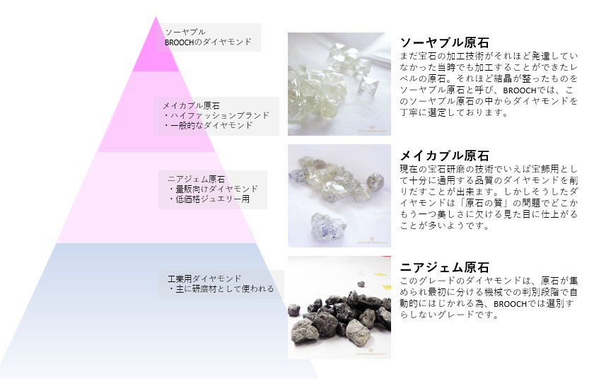 原石とは、磨けば光る石の事を指す言葉です。磨いても光らない石は原石と本来呼びません。ダイヤモンドに限らず宝石の美しさは「原石」と「研磨者」で決まります。BROOCHで拘るのは最高の素材を用意することなのです。