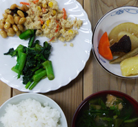 おからサラダ、菜の花のおひたし、根菜の煮物、煮豆、具たくさんの味噌汁