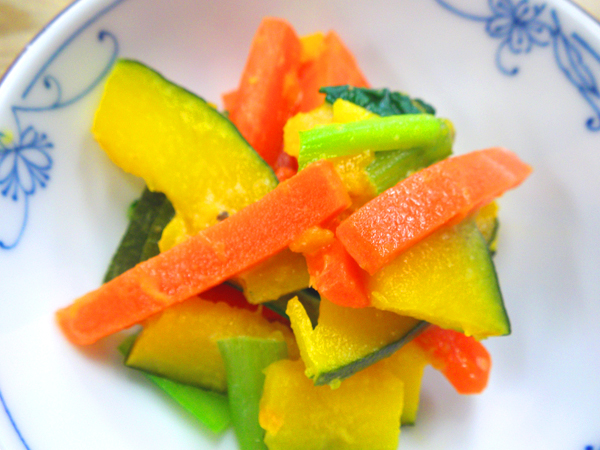 温野菜は南瓜ににんじん、小松菜にしゃぶしゃぶのゴマだれをあえたもので