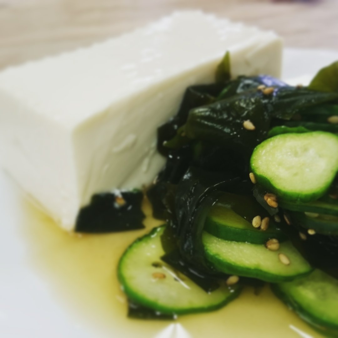 (写真右)どーんとヤッコ(豆腐)半分にきゅうりとワカメの酢の物