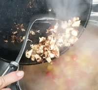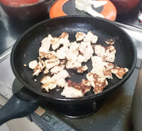⑤④に水をひたひたくらい入れて、沸騰したら②の鶏肉を加える。