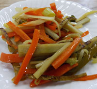 ①ごぼう、にんじん、セロリ、ピーマンを細くきる。