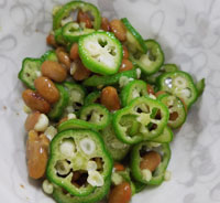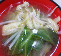 キャベツ、もやし、油揚げのお味噌汁にみょうがをのせて。