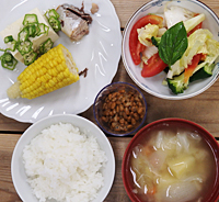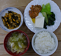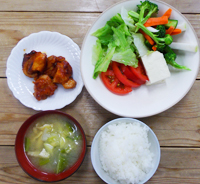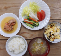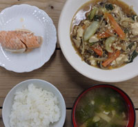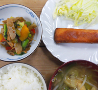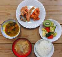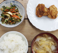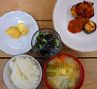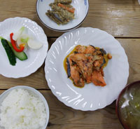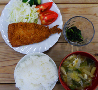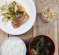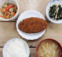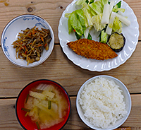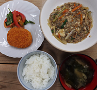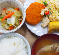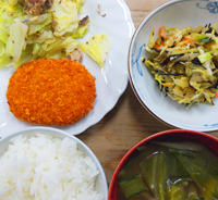 コロッケとごま油サラダ+バナナ付き&野菜炒め&ハタハタの味噌汁