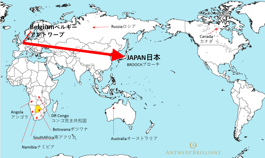 BROOCHの取り扱うダイヤモンドはデビアスグループのダイヤモンド鉱山ボツワナ、ナミビア、南アフリカ、カナダの4拠点で採掘された高品質な原石を使用しています。ダイヤモンド原石はこの4カ国以外にもいくつかの国で採掘されており、それぞれ専門の地下資源採掘企業が操業しています。現在ダイヤモンド原石を産出する国は上記世界地図に示した限られた場所だけなのです。