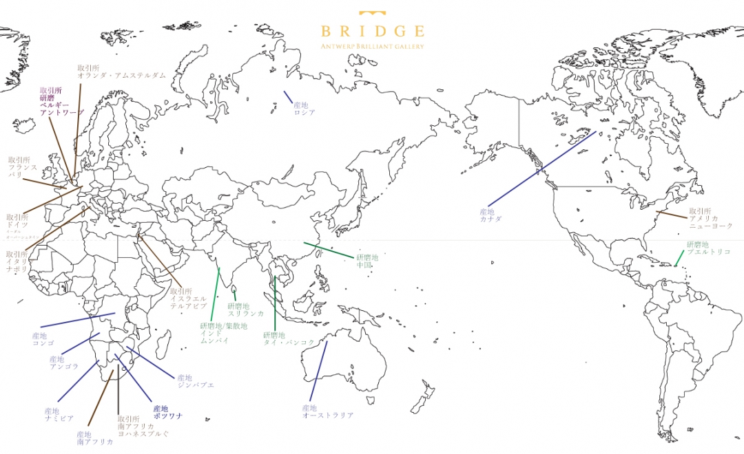 4C評価で取引される研磨済みダイヤモンドでは原石の品質差や産地名による販売価格の差異は在りませんが、お持ちに成るダイヤモンドの産地に想いを馳せるのも素敵な事だと思います。BROOCHではボツワナのジュワネング鉱山を中心とするデブスワナのトップ原石を中心に原石の選定を行っています。