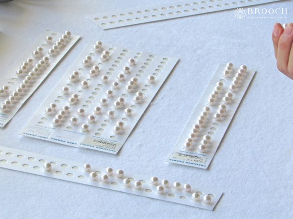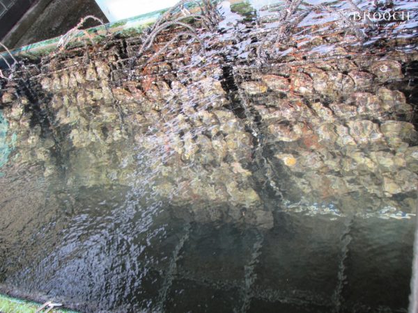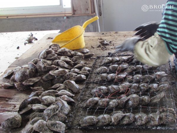 まず初めに真珠養殖の基礎知識としてあこや貝には「当年もの」と呼ばれる4・5月にあこや貝に真珠核を挿核し、年をまたいで1・2月までの9~10か月の養殖期間貝を海の中で育てて浜上げするものと、4・5月に挿核し翌年の12月までの20~21か月(1年半)の養殖期間とる「越もの」とが有るのですが、ブローチで取り扱う真珠は「越もの」だけ、「当年もの」は取り扱いません。