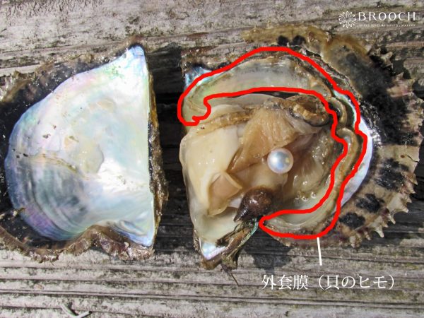 細胞貝(さいぼうがい)というベースとなる美しい真珠層を持つ細胞貝から、外套膜(がいとうまく)”貝のヒモ”部分を切り取ります。下写真、貝の左半分は貝殻の内側が見えていると思いますが、これが真珠層で覆われている部分です。この成分で不純物を巻き込んだものが真珠の珠と成るので、核と一緒に切り取った外套膜を挿入して真珠層で覆う様に誘導するのです。