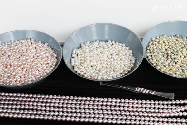 真珠もダイヤモンドと同様に品質基準が有りますそれは大きさ(サイズ)、色、形、キズ、テリ(光沢)、巻きの6つの要素です。真珠にはダイヤモンドのような世界共通の品質基準がありません。その為この6項目をアソーターの役割の人間が行い品質ごとに真珠を仕分けします。ブローチの真珠の内、無調色ナチュラルは大記載以外の5項目が最高評価の物だけが選定されます。更にその中にある僅かな違いを見抜いてネックレスの連に仕分けしていきます。真珠の品質7項目の最後は”連想(れんそう)”とあり合う真珠の品質が同じことで経年劣化で起こる真珠の劣化スピードを併せて判り難くするのです。