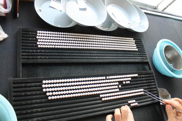 厳選されたSグレードの真珠で色合わせします。あこや貝の色は実体色と干渉色とで色が作り出されます。そして表面のキメと傷の有り無しでその美しさが良く発揮されるかどうかが決まります。中でも干渉色は光の干渉で生み出される色なので非常に複雑な色合いです。真珠のネックレスは50粒程度必要としますが、その50粒はなんと2万粒程度の中から色合いをそろえて選び出していくのです。