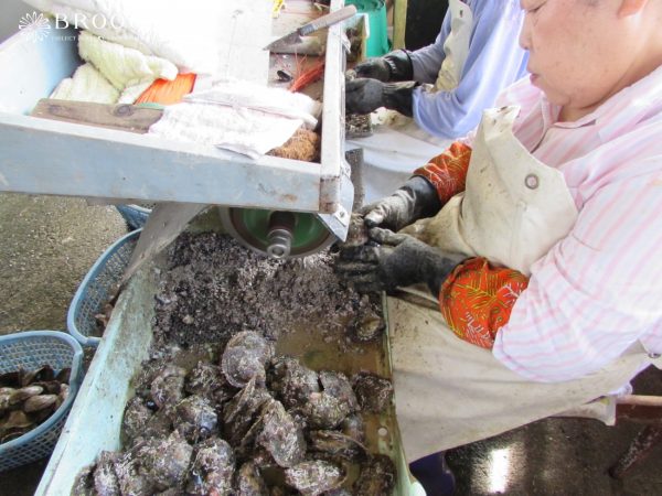 海から引き上げられたあこや貝はネットから出され、まずは生きている貝と死んでいる貝に分けられます。生きている貝は貝柱と真珠、貝殻に分けられます。あこや貝の貝柱は食用になりますのでここで仕訳けて別に出荷されます。貝柱以外の部分には真珠が入っていますので分離機で貝の部分と真珠とを分離し取り出します。あこや貝の貝殻は別に出荷されボタンや螺鈿等の装飾材料となります。中には時計の文字盤に使われる事も在ります。こうしてあこや貝は出来るだけ余すことろなく使われているのです。