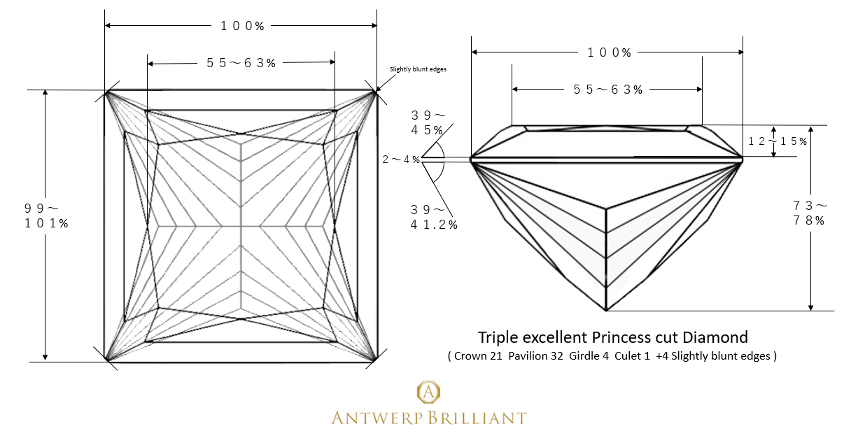 今回のトリプルエクセレントの試みによって、厚いカットや平坦なカット等ど一線を画すプリンセスカットの本来の美しさをお楽しみいただけるようになりました。