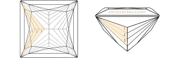 イツコウィッツによって見いだされた新しい形のダイヤモンド、”クァドリリオンカット”ですが、これをイスラエルのダイヤモンド研磨工たちが真似て多くの四角形のダイヤモンドがこの後、市場に登場します。現在のプリンセスカットにはカラットサイズや原石の目に沿って設けられた2~4段のシェブロンファセットが存在します。イツコウィッツのクァドリリオンカットではそれらのシェブロンファセットの設定が在りませんでしたので、この時市場に出回った多くの四角のダイヤモンドはイツコウィッツのクァドリリオンカットとは若干異なる形だったのです。