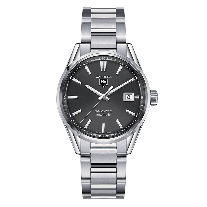 シルバー×ブラックのメリハリ効いたデザインが、モダンで洗練された表情を見せる41ミリのタグホイヤーカレラキャリバー5自動巻きのドレスウォッチです。視認性抜群のブラックダイヤルにシルバーの長身短針がシンプルに映えます。素材に採用されている316Lステンレススティールは医療用に使われる様な高級ステンレス素材で、それを鍛造仕上げしたケースとブレスレットはかっちりとシャープな線でカッコよく、スーツの袖からチラッと見えるだけでちょっとテンション上がります。