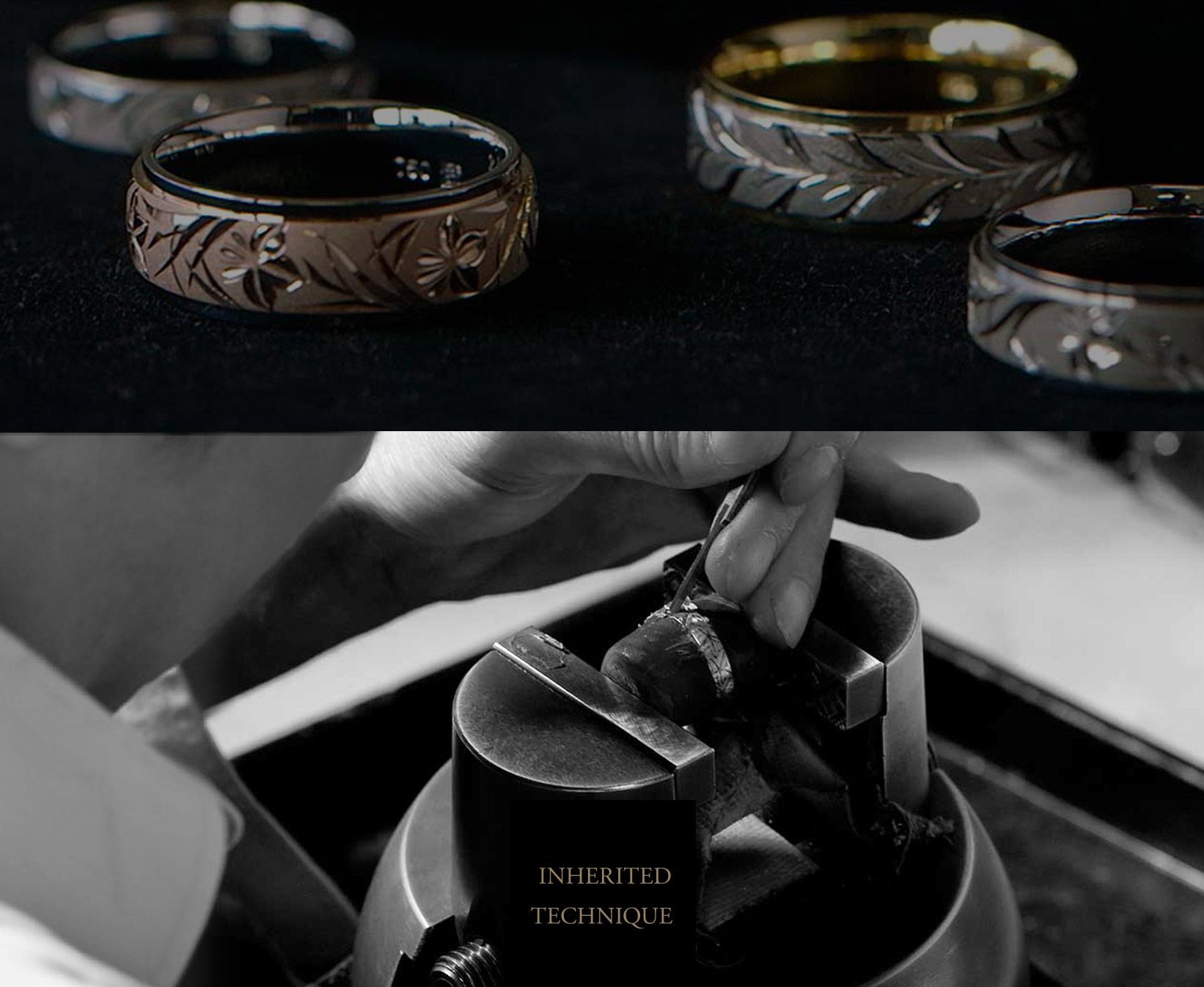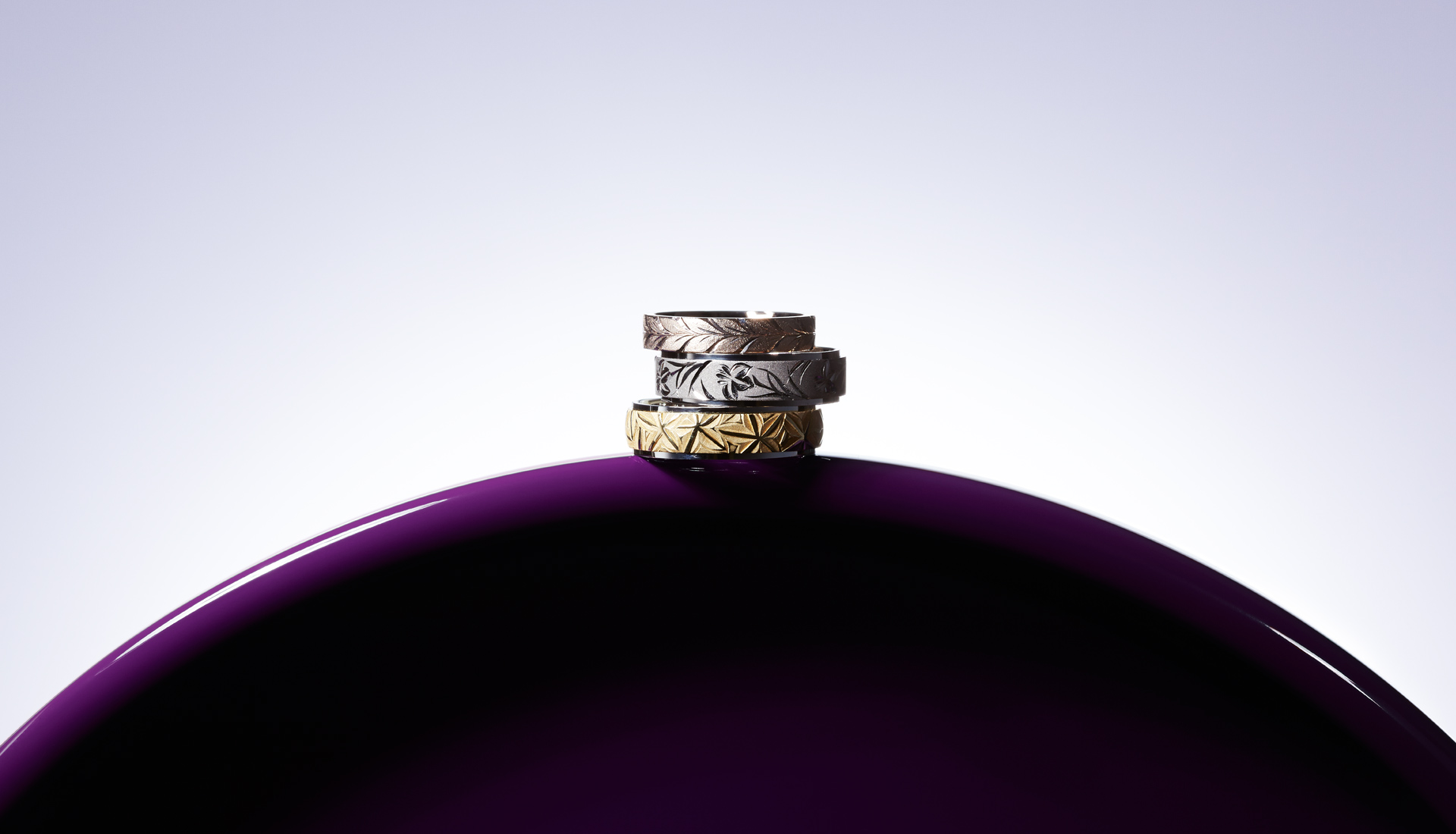 ふたりだけの特別なビーチをテーマにして、その空間を創り出す全ての 要素を指輪のモチーフにしました。ハワイアンの手彫りが施されたリングにはめずらしいスタイリッシュなフォルムと、幅広い素材のセレクトが特徴です。