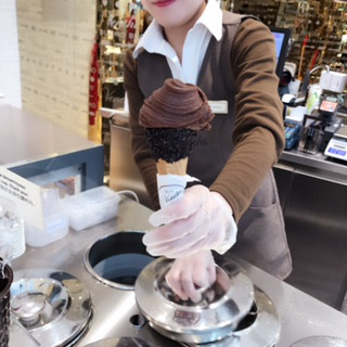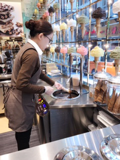 チョコレートコートのコーンを頼むとその場でチョコをかけて、コーンを作ってくれます!