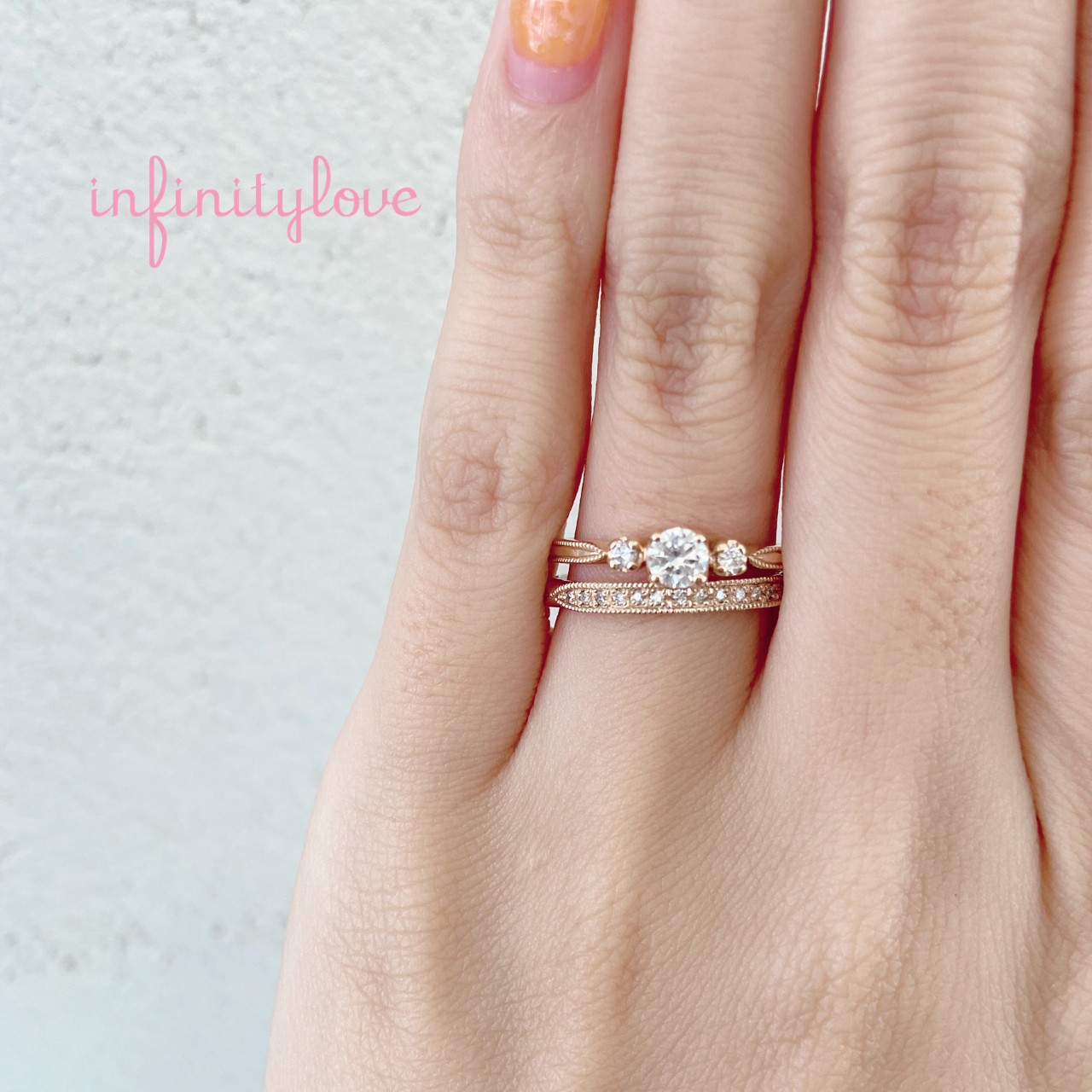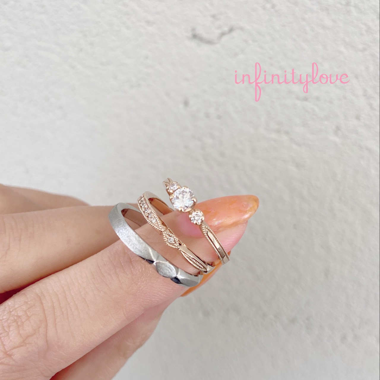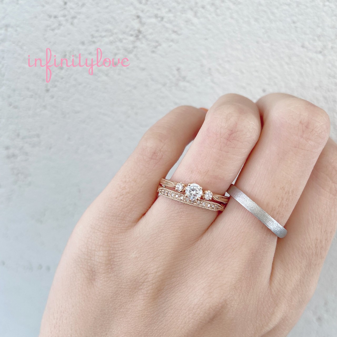 ブランド名のインフィニティラブ(infinity love)は主に『無限大の愛』という意味で、それぞれのリングデザインには永遠や可能性・愛の絆という意味を持たせたテーマで描いています。