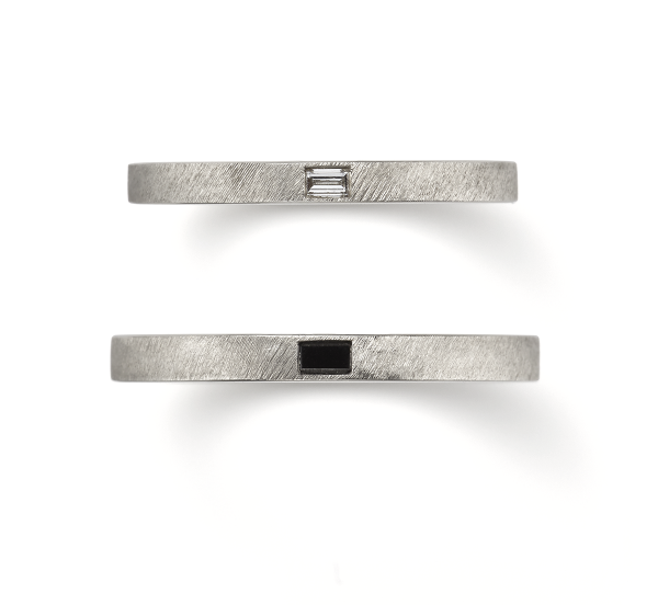 まずは「adagio(アダージョ)」です。リング名であるアダージョは、音楽記号で”ゆるやかに”という意味があります。おふたりが共に歩む人生が穏やかで、どんな時も同じ方向を向いて同じ気持ちで歩んでほしいという想いが込められています。リングの表面がマットな質感で、そこにセッティングされているエメラルドカットダイヤモンドが繊細に美しく輝く素敵なリングです。